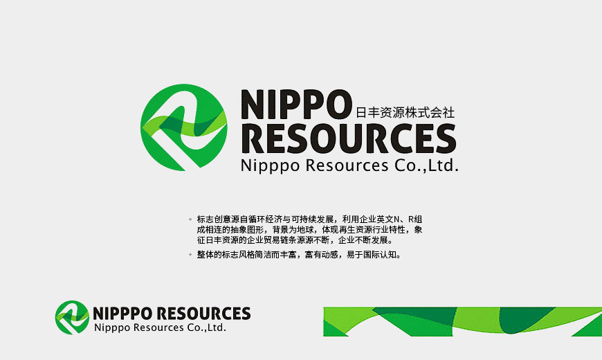 VI企業(yè)形象設(shè)計(jì)創(chuàng)意源自循環(huán)經(jīng)濟(jì)與持續(xù)發(fā)展,利用日豐資源株式會(huì)社NIPPO RESOURCES CO.,LTD.企業(yè)英文N、R組成相連的抽象形,背景為地球,體現(xiàn)再生資源行業(yè)特征,象征日豐資源的企業(yè)貿(mào)易鏈條源源不斷,企業(yè)不斷發(fā)展。疊透的LOGO元素設(shè)計(jì)風(fēng)格簡(jiǎn)潔而豐富,富有動(dòng)感,易于國(guó)際認(rèn)知。