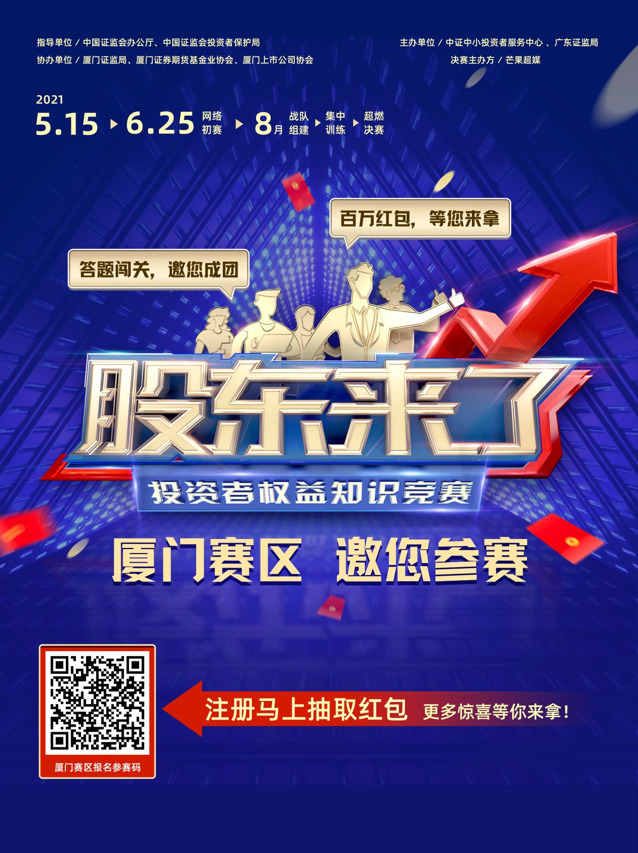 2021年是“十四五”規劃開局之年,為進一步落實證監會黨委關于資本市場人民性要求和保護投資者合法權益的職責,在會辦公廳、投保局指導下,投服中心將聯合廣東、四川、湖北、內蒙古、海南、西藏六證監局共同舉辦《股東來了》2021投資者權益知識競賽,面向廣大中小投資者普及權益知識,示范引領全面知權、積極行權、依法維權。